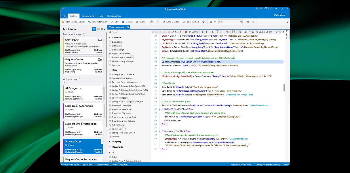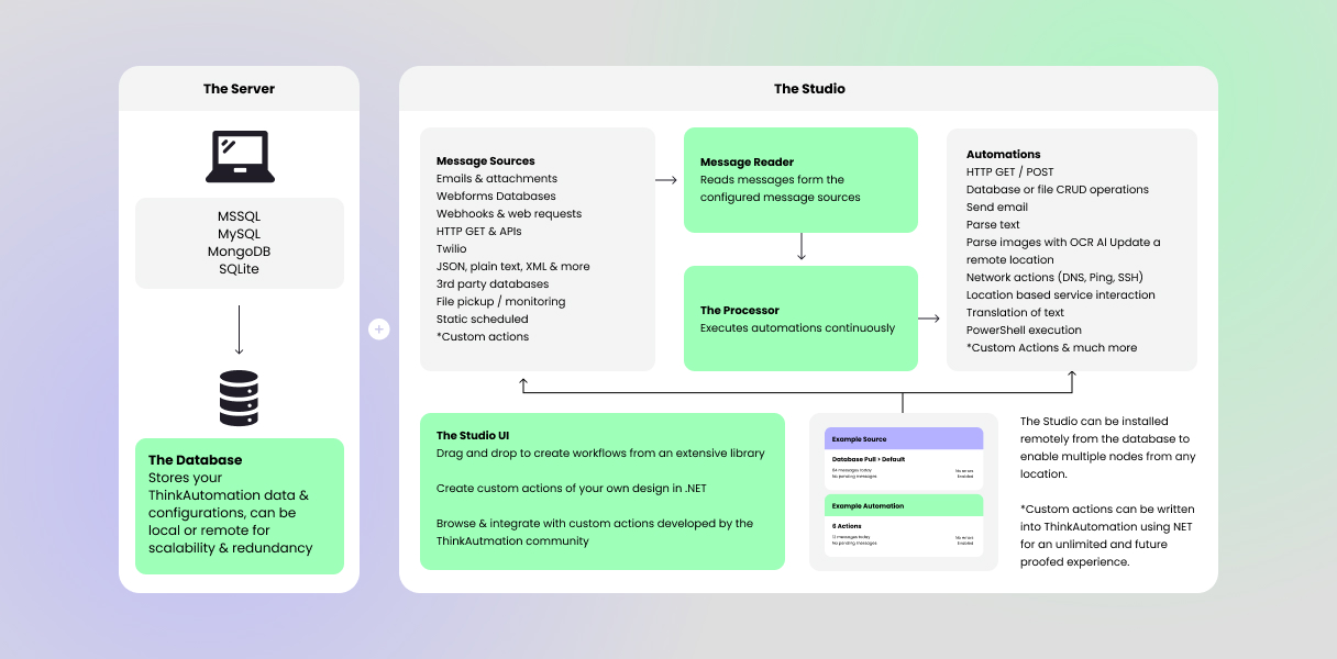 The ThinkAutomation Studio is used to configure your message source triggers and to build and test your automation workflows. It can also be used to view the Message Store of processed messages and to configure Custom Actions. You can run the Studio on the same computer running the ThinkAutomation Server or on any remote computer that can connect to it.